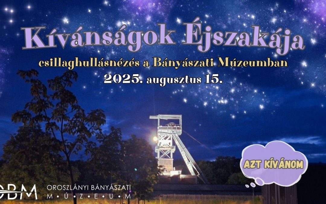 2025. augusztus 15-én, pénteken egy igazán különleges programmal várja a látogatókat az Oroszlányi Bányászati Múzeum: megrendezésre kerül a Kívánságok Éjszakája, amelyben a nyári est varázsát a csillagok fénye, a mozi élménye és a hangulatos szabadtéri zene teszi teljessé.